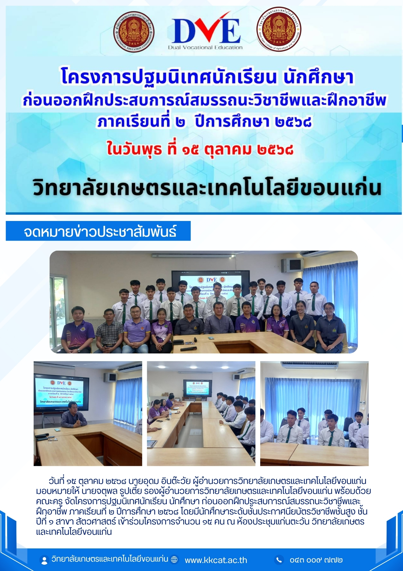 วันที่ 15 ตุลาคม 2568 นายอุดม อินต๊ะวัย ผู้อำนวยการวิทยาลัยเกษตรและเทคโนโลยีขอนแก่น มอบหมายให้ นายจตุพล รูปเตี้ย รองผู้อำนวยการวิทยาลัยเกษตรและเทคโนโลยีขอนแก่น พร้อมด้วยคณะครู จัดโครงการปฐมนิเทศนักเรียน นักศึกษา ก่อนออกฝึกประสบการณ์สมรรถนะวิชาชีพและฝึกอาชีพ ภาคเรียนที่ 2 ปีการศึกษา 2568 โดยมีนักศึกษาระดับชั้นประกาศนียบัตรวิชาชีพชั้นสูง ชั้นปีที่ 1 สาขา สัตวศาสตร์ เข้าร่วมโครงการจำนวน 15 คน ณ ห้องประชุมแก่นตะวัน วิทยาลัยเกษตรและเทคโนโลยีขอนแก่น