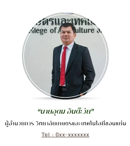 Posted in: Uncategorized คณะผู้บริหาร วิทยาลัยเกษตรและเทคโนโลยีขอนแก่น Written by admin ธันวาคม 1, 2025มีนาคม 28, 2026 Leave a Comment on คณะผู้บริหาร วิทยาลัยเกษตรและเทคโนโลยีขอนแก่น